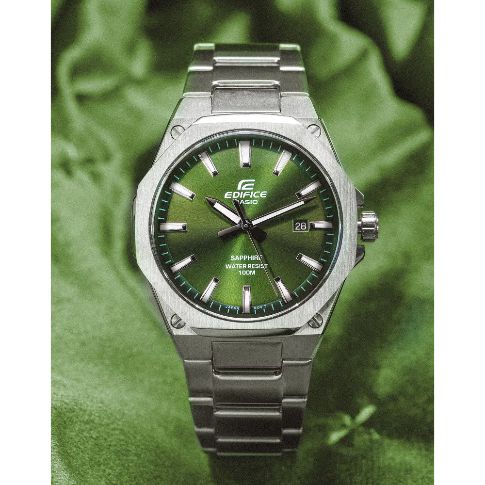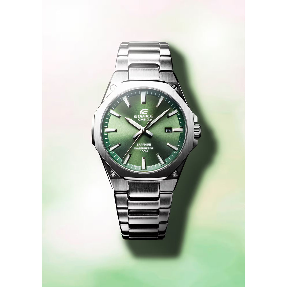 Nuovi EDIFICE SLIM con vetro zaffiro questo modello analogico a tre sfere presenta una cassa sottile da 7,8 mm di spessore per garantire una maggiore vestibilità. L'orologio vanta un quadrante ottagonale piatto con finitura a filo che dona all'orologio un aspetto sportivo e lussuoso al tempo stesso. Ultimo, ma non per importanza, la presenza di vetro zaffiro antigraffio che rimarca il pregio e il valore di queste novità.PrecisionePrecisione: u00b120 secondi al meseAltre caratteristicheIndicazione dell'ora regolare:Analogico: 3 lancette (ora, minuto, secondo)Visualizzazione della dataVetroVetro zaffiro con rivestimento antiriflessoCinturino regolabileDa 150 a 205 mmDimensioni della cassa (A x L x P)44.8 u00d7 39.9 u00d7 7.8 mmPeso110 gMateriale della cassa e della lunettaacciaio inossidabileCinturinoCinturino in acciaio inossidabileChiusura one-touch a 3 piegheImpermeabilitàImpermeabile fino a 10 barAlimentazione e durata della batteriaDurata approssimativa della batteria: 3 anni con SR916SW