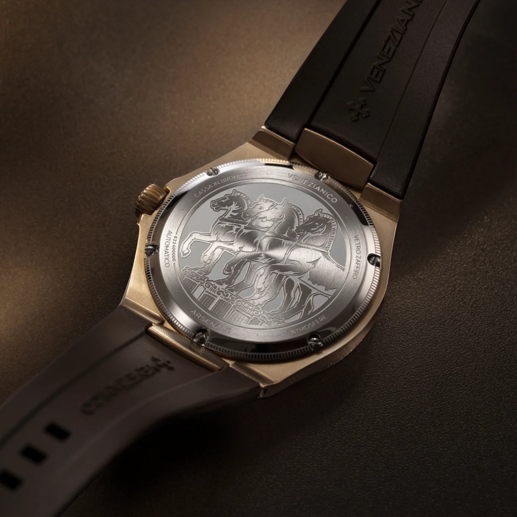 Arsenale Bronzo si distingue non solo per il suo design, ma anche per la sua capacità di evolversi, acquisendo una personalità unica attraverso il naturale sviluppo di una patina. Disponibile con cinturino in gomma, questo segnatempo incarna la vitalità del bronzo, offrendo un mix di stile e funzionalità adatto a chiunque cerchi un orologio resistente e accattivante.