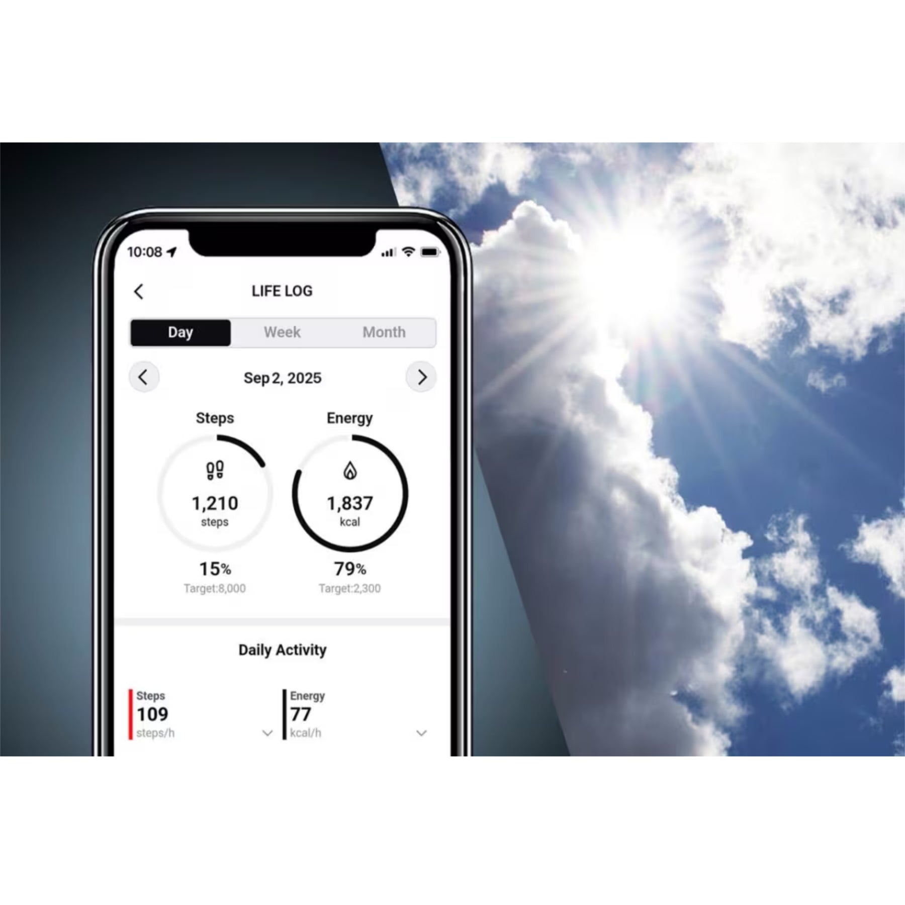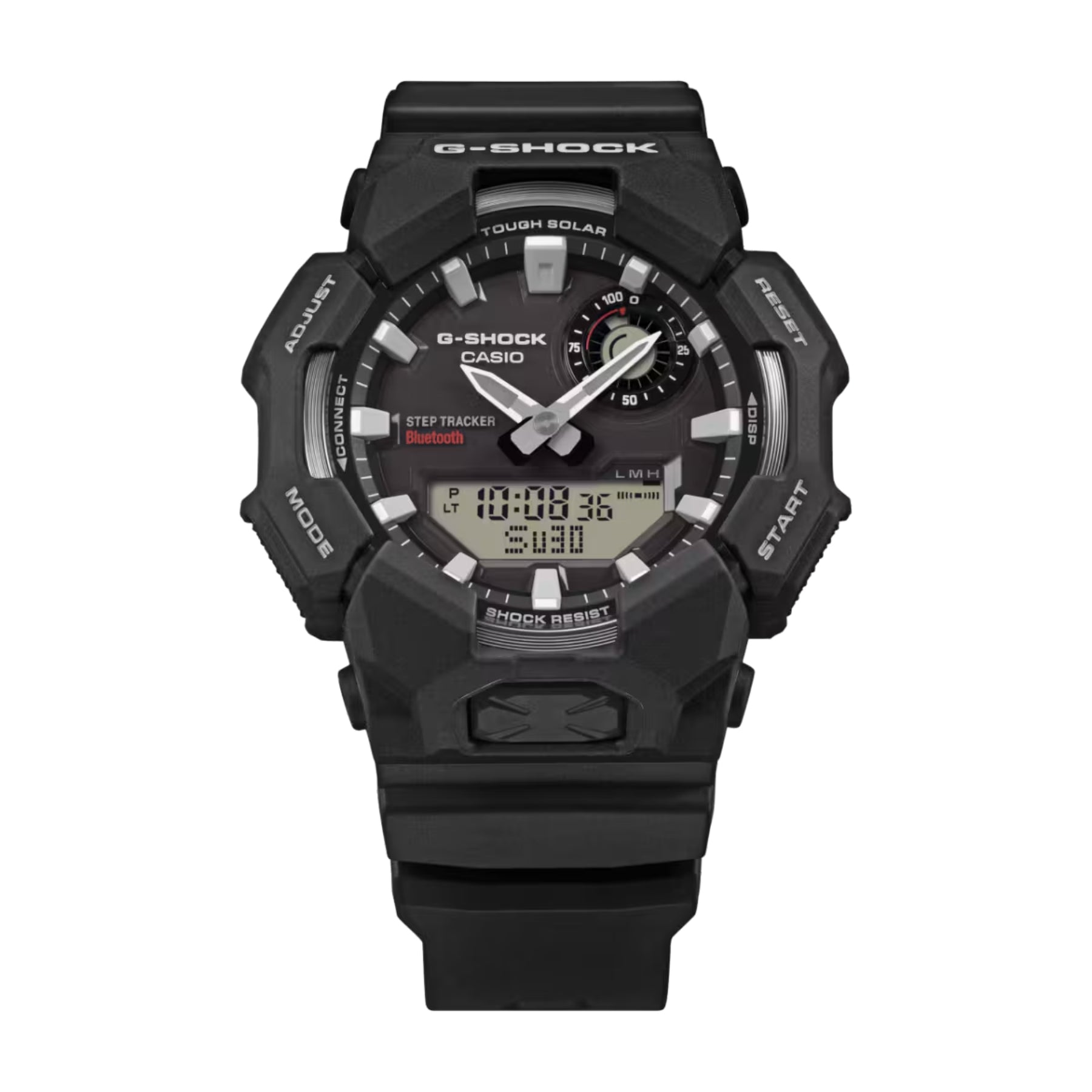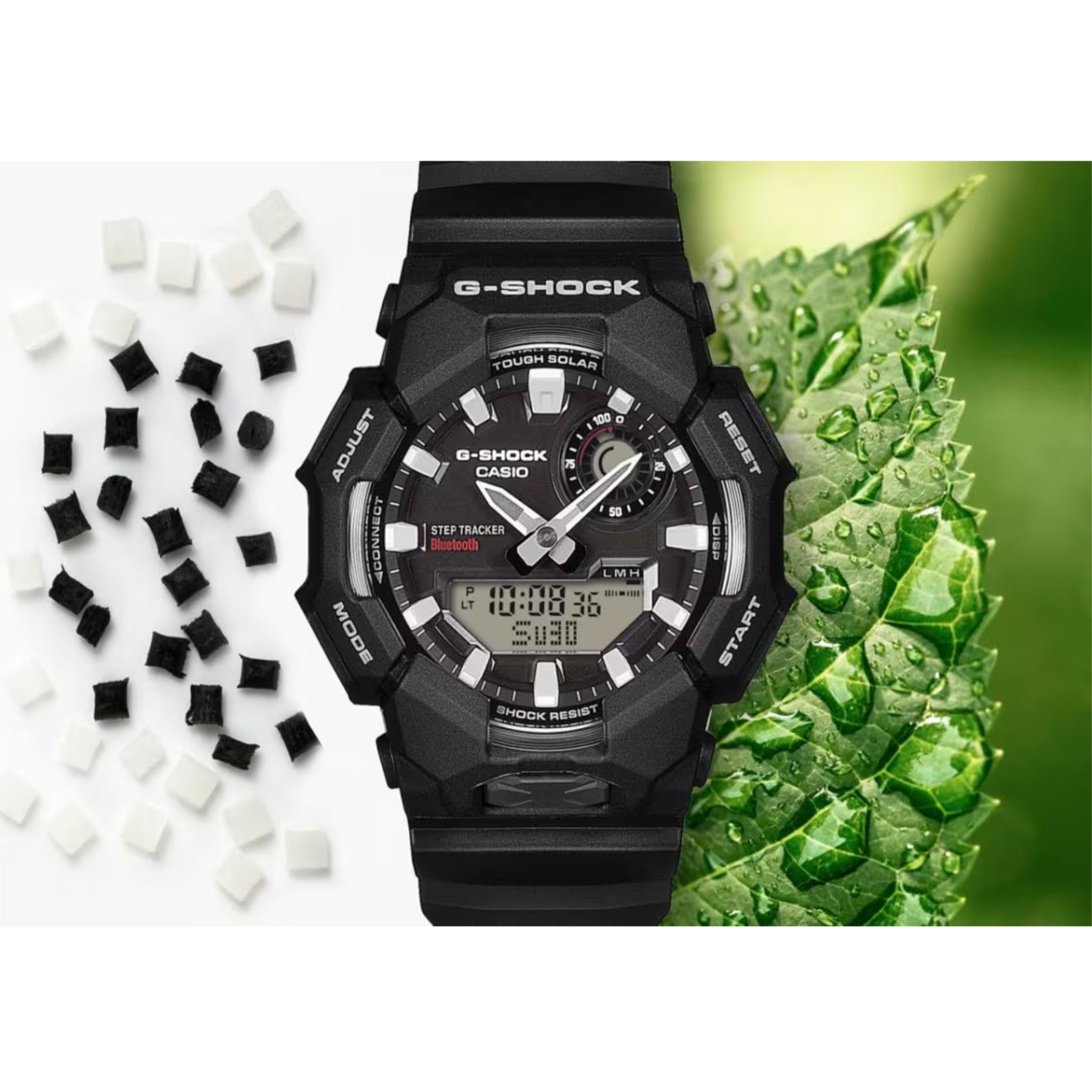 Presentazione dell'orologio a energia solare in grado di tracciare e visualizzare digitalmente i passi.La combinazione analogico-digitale GA-B010 è caratterizzata da una cassa di grandi dimensioni con un ampio display di facile lettura. Finiture deliziosamente dettagliate - con un anello della lunetta trattato con deposizione di vapore, ricarica solare e una lavorazione metallica applicata al quadrante inset - aggiungono ulteriore valore al design di questo modello. Questo orologio richiede solo l'energia solare per contare i passi e visualizzare i dati tracciati sul display digitale. L'orologio invia inoltre i dati a uno smartphone accoppiato tramite Bluetooth®, per una funzionalità completa a portata di mano. È sufficiente collegarsi all'app CASIO WATCHES per ottenere un cronometraggio automatico di precisione e per gestire facilmente i registri di vita dal telefono. L'orologio offre funzioni pratiche come l'ora mondiale e il cronometro, oltre a una luce LED ad alta luminosità che può essere accesa e spenta utilizzando il grande pulsante sulla parte anteriore della cassa. Gli indici e le lancette dell'orologio fosforescenti garantiscono la visibilità anche al buio. Il cinturino è realizzato con resina a base biologica, un materiale ideato per contribuire a ridurre l'impatto ambientale.Questo orologio, che consente di passare con disinvoltura da un ambiente informale a una riunione di lavoro, è destinato a durare negli anni.Dimensioni della cassa (A x L x P)Icona di domanda52.3 u00d7 49.3 u00d7 15.2 mmPesoIcona di domanda57 gMateriale della cassa e della lunettaCarbonio a base biologica/Resina a base biologicaCinturinoCinturino in resina a base biologicaStrutturaResistente agli urtiImpermeabilitàImpermeabile fino a 20 barRegolazione dell'oraBluetooth: si connette a uno smartphone e regola automaticamente l'oraAlimentazione e durata della batteriaTough Solar (a energia solare)Funzione del sensoreMisurazione del conteggio dei passi:Intervallo di visualizzazione del conteggio dei passi: da 0 a 999.999 passi Visualizzazione dell'avanzamento verso l'obiettivo passi (intervallo di impostazione dell'obiettivo passi: da 1.000 a 50.000, con incrementi di 1.000 passi)Promemoria passi (informa l'utente quando il conteggio dei passi è troppo basso, tramite display e segnale acustico).Indicatore di passoFunzione di connessione allo smartphoneMobile Link (collegamento wireless tramite Bluetooth®)AppCASIO WATCHESFunzione di connessione all'appRegolazione orologio automaticaImpostazione semplice dell'orologioOra internazionale di circa 300 cittàDati Life LogInformazioni sull'appOra e posizioneTrova telefonoVetroVetro mineraleCinturino regolabile145 to 215 mmVarieNeobriteOra internazionaleOra internazionale 38 fusi orari (55 città + tempo coordinato universale), attivazione/disattivazione dell'ora legale, passaggio automatico all'ora legale (DST), passaggio dalla città per l'ora del proprio fuso orario alla città per l'ora internazionaleCronometroCronometro a centesimi di secondoCapacità di misurazione:00'00''00~59'59''99 (per i primi 60 minuti)1:00'00~23:59'59 (dopo 60 minuti)Unità di misura: 1 centesimo di secondo (per i primi 60 minuti)1 secondo (dopo 60 minuti)Modalità di misurazione: tempo trascorso, tempo sul giro, tempo parzialeTimerTimer conto alla rovesciaUnità di misura: 1 secondoIntervallo conto alla rovescia: 24 oreIntervallo impostazione dell'ora di inizio del conto alla rovescia: da 1 minuto a 24 ore (incrementi di 1 secondo)Promemoria sonoro /Segnale orario5 promemoria sonori giornalieriSegnale orarioLuceDoppia luce LEDLuce LED per il quadrante (illuminazione LED completamente automatica, Super Illuminator, durata illuminazione selezionabile (1,5 o 3 secondi), luminescenza)Retroilluminazione LED per il display digitale (illuminazione LED completamente automatica, Super Illuminator, durata illuminazione selezionabile (1,5 o 3 secondi), luminescenza)Colore chiaroLED: biancoCalendarioCalendario automatico completo (fino all'anno 2099)Disattivazione del volumeAttivazione/disattivazione del segnale acustico di pressione pulsantiFunzione di risparmio energeticoRisparmio energetico (il display si spegne per risparmiare energia quando l'orologio viene lasciato al buio)Visualizzazione/avviso dello stato della batteriaIndicatore del livello della batteriaCronometraggio della corsaTempo di funzionamento approssimativo della batteria:5 mesi con batteria ricaricabile (periodo di funzionamento con uso normale senza esposizione alla luce dopo la carica completa)26 mesi con batteria ricaricabile (periodo di funzionamento se conservato in condizioni di oscurità totale con la funzione di risparmio energetico attivata dopo la carica completa)PrecisionePrecisione: u00b115 secondi al mese (senza funzione Mobile Link)Altre caratteristicheFunzione di spostamento delle lancette (le lancette si spostano per non bloccare la visualizzazione del contenuto del display digitale).Formato 12/24 oreIndicazione dell'ora regolare:Analogico: 2 lancette (ora, minuto (la lancetta si muove ogni 20 secondi))Digitale: ora, minuto, secondo, pm, mese, data, giorno del meseVisualizzazione giorno (giorni della settimana selezionabili in sei lingue)