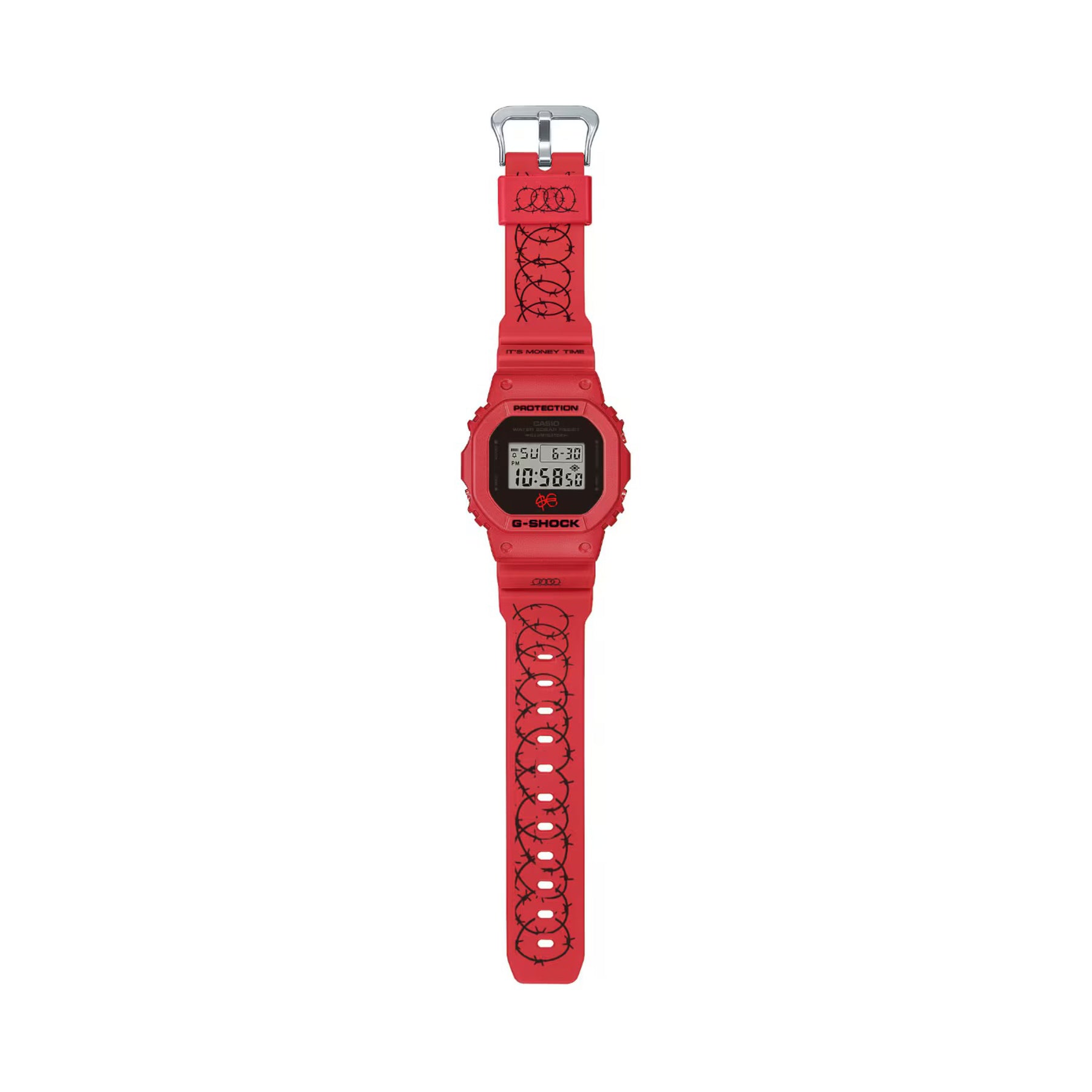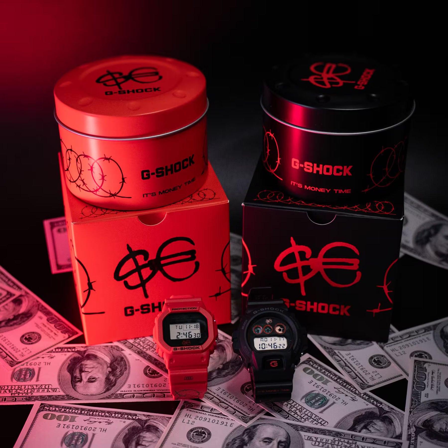 La partnership tra Sfera Ebbasta e G-SHOCK fonde perfettamente il percorso creativo dell’Artista con la tradizione e l'innovazione ingegneristica di G-SHOCK. Audace e meticolosamente rifinito, questo orologio è l'accessorio definitivo per chi vive al massimo ed è #BuiltDifferent. Questa esclusiva collaborazione vede Sfera Ebbasta reinterpretare e personalizzare due casse storiche di G-SHOCK, la serie 5600 e 6900. Ogni dettaglio racconta una storia, il cinturino è caratterizzato da un motivo a filo spinato, aggiungendo un tocco di streetwear al design indistruttibile di G-SHOCK. Il mantra “It’s Money Time” è impresso sul cinturino, il logo $€ è inciso con cura sul fondello ed è presente sulla cassa dell’orologio. La retroilluminazione, personalmente scelta dall’artista di colore rosso, tinta distintiva e simbolica di Sfera Ebbasta, svela magicamente il logo $€ sul quadrante. Tutti i dettagli conferiscono esclusività a questi modelli, rendendoli unici. Sfera Ebbasta ha infuso nel design di questi orologi un'energia unica, scegliendo come palette il rosso intenso e il nero, con elementi cromatici inversi per un look che non passa inosservato. Due modelli iconici, due colorazioni speculari, pensati per chi vuole ridefinire le proprie regole.