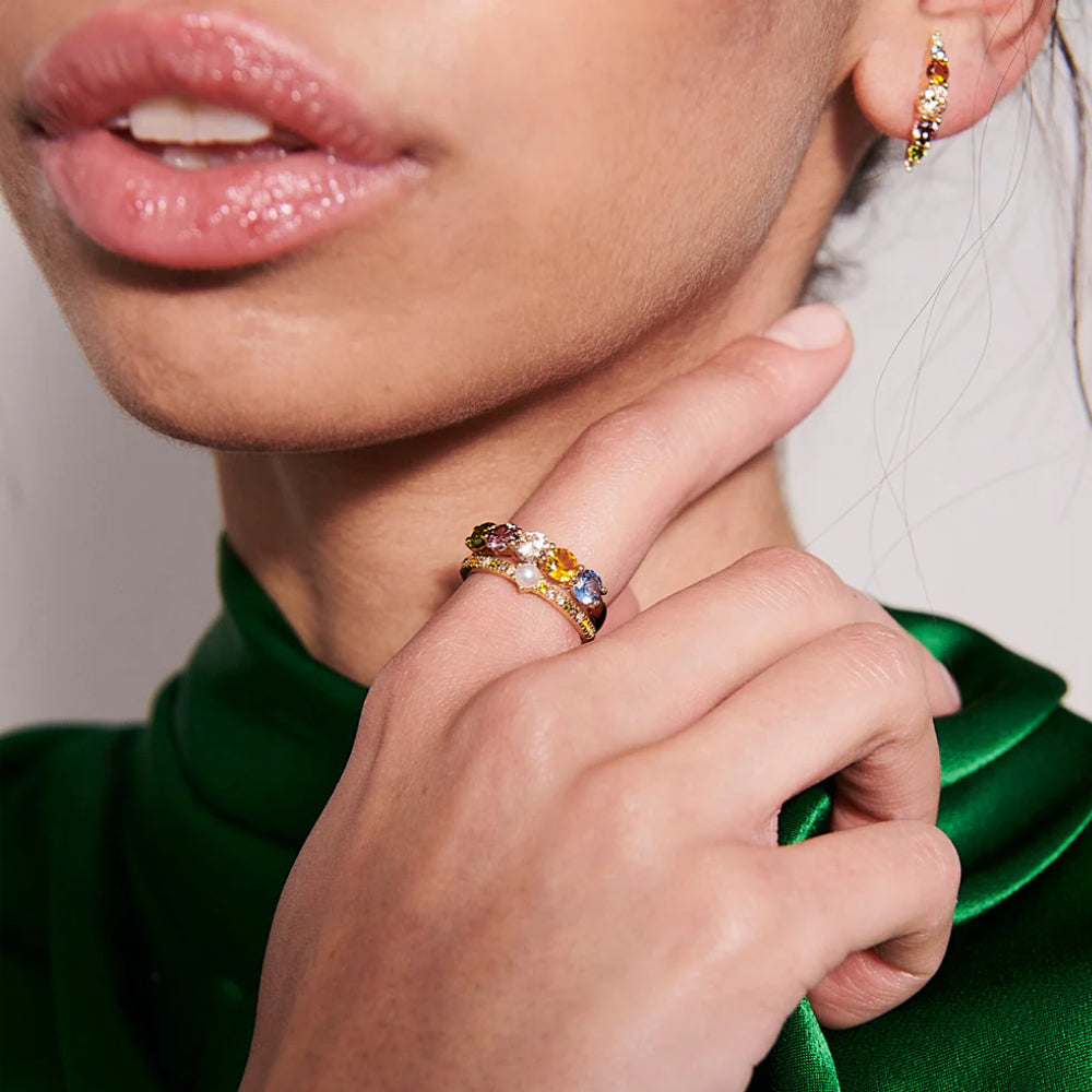 Anello realizzato in argento sterling 925 placcato oro 18 carati, superficie lucida con zirconi multicolori a taglio sfaccettato.Misure dell'anello: larghezza 4,5 mm, spessore 1,2 mm