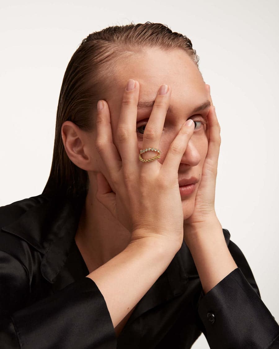 A collection that celebrates the essence of life: constant change. The designs follow a wave motif that evokes the magical dance of water in an ocean that never stands still. Crafted from 18k gold-plated sterling silver, these pieces feature stones set in an exclusive 8-prong setting. Stud earrings, hoop earrings, necklaces, and rings feature turquoise blue crystals hand-set on a mother-of-pearl base, as well as citrus green and white cubic zirconia. A palette that evokes images of the sea and a brilliant flow of energy.