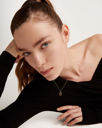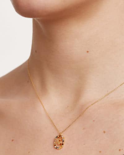 MATERIAL: 925 Sterling Silver FINISH: 18k Gold Plating STONES: Tiger's Eye Labradorite Mother of Pearl with Crystal Yellow Gold Crystal Peridot Green Crystal Olive Green Crystal Blue Spinel Crystal Violet Rhodolite Crystal Pure White Crystal STONE DIAMETER: 1.5 mm OVAL DIMENSIONS: 10.5 x 15 mm FRONT LETTER HEIGHT: 6.5 mm LETTER THICKNESS: 3 mm CHAIN: Adjustable clasp from 40 to 50 cm WEIGHT: 2.5 g The strength of a name knows no boundaries. A name carries the truth, it tells a story. With self-love as a permanent state of mind, this collection embodies uniqueness and pays homage to confidence in a new design framework. Harkening back to the 1990s and giving a twist to their enchanting nostalgia, floating letters rise as the ultimate personal symbol: a new reality is born from a piece of jewelry that highlights your true self and speaks your name out loud. Labradorite, tiger's eye, mother-of-pearl, and colorful crystals blend in a luminous, slightly squared oval that holds your initial like a treasure, creating a timeless necklace that will become your personal icon. As if floating in the air, an 18-karat gold-plated initial hangs within an amulet, a prominent 925 sterling silver piece that will transform into a bold statement of intent. The nuances and veining surrounding the semi-precious stones are exclusive to each necklace, making each piece truly unique.