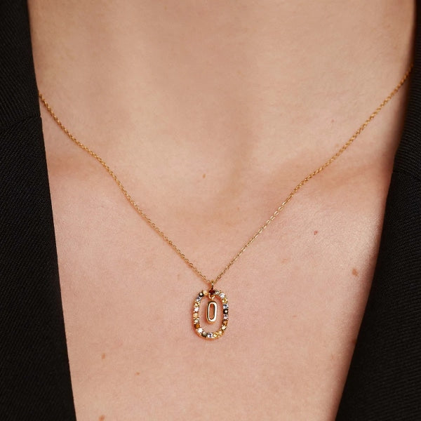 MATERIAL: 925 Sterling Silver FINISH: 18k Gold Plating STONES: Tiger's Eye Labradorite Mother of Pearl with Crystal Yellow Gold Crystal Peridot Green Crystal Olive Green Crystal Blue Spinel Crystal Violet Rhodolite Crystal Pure White Crystal STONES DIAMETER: 1.5mm OVAL DIMENSIONS: 10.5 x 15mm FRONT LETTER HEIGHT: 6.5mm LETTER THICKNESS: 3mm CHAIN: Adjustable clasp from 40 to 50cm WEIGHT: 2.5g SKU: CO01-274-U