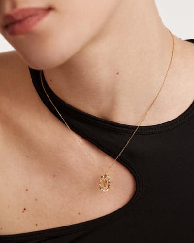 Labradorite, tiger's eye, mother-of-pearl, and colorful crystals blend in a luminous, slightly squared oval that holds your initial like a treasure, creating a timeless necklace that will become your personal icon. As if floating in mid-air, an 18-karat gold-plated initial hangs within an amulet, a prominent 925 sterling silver piece that will transform into a bold statement. The nuances and grain patterns surrounding the semi-precious stones are exclusive to each necklace, making each piece truly unique.