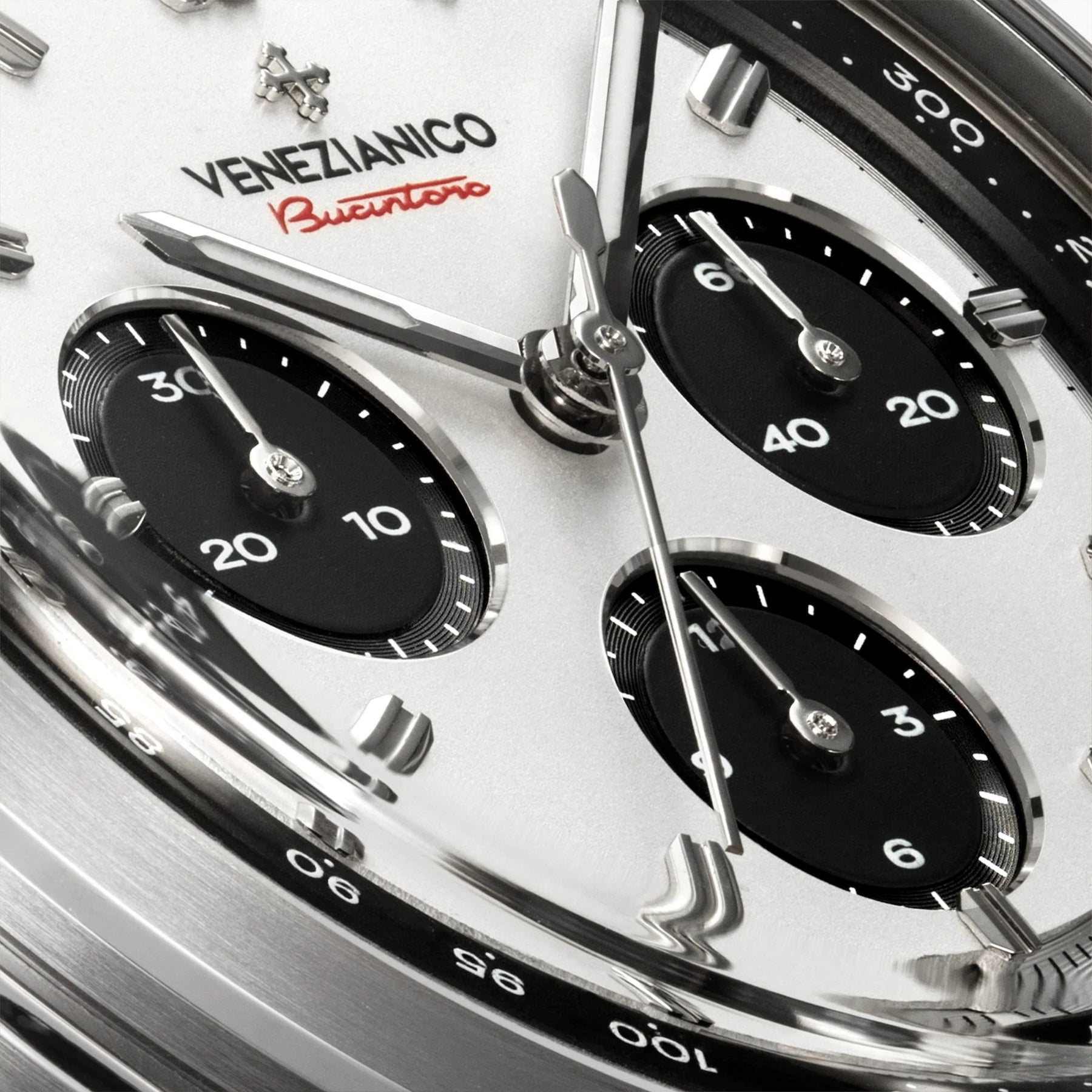 Il Bucintoro è il nostro cronografo, un orologio in grado di misurare di specifici intervalli di tempo, pensato per coniugare precisione ed eleganza in un design contemporaneo. Il suo nome si ispira all'omonima galea del Doge, capo di stato della Serenissima. Tradizionalmente, la nave apriva le danze alla Regata storica, che vedeva come protagonisti i migliori rematori di Venezia e rappresentava la maggior competizione sportiva sul Canal Grande.MATERIALE CASSA: Acciaio 316LDIMENSIONI: u00d842mm, da ansa ad ansa 49SPESSORE: 11.70mm (vetro escluso)VETRO: 1.90mm, vetro in zaffiro bombato con antiriflessoMOVIMENTO: Cal. Seiko NE88A AutomaticoFUNZIONI: Cronografo, reset istantaneoCARATTERISTICHE: Ruota a colonne, innesto verticalePIGMENTO LUMINESCENTE: BGW9 Super-LumiNova®LUNETTA: Acciaio 316LRESISTENZA ALL'ACQUA: 10ATM (= 100mt)BRACCIALE: CanovaLa Galea del DogeIl nostro cronografo prende il nome di Bucintoro, il sontuoso vascello utilizzato dal Doge di Venezia per aprire l'annuale competizione di voga che oggi è nota come Regata Storica. Questa gara rappresenta l'unione ideale del concetto agonistico di velocità sull'acqua con l'eleganza della tradizione.Un'eccellenza tra icronografi meccaniciIl Seiko NE88 / 8R48 è tra i più prestazionali della gamma di movimenti cronografici automatici di Seiko, viene assemblato a mano solo dai loro orologiai più esperti e altamente qualificati con decenni di esperienza. Abbiamo scelto di equipaggiare il nostro cronografo con questo movimento in virtù delle sue eccellenti prestazioni che lo distinguono chiaramente da tutti gli altri calibri cronografici nella stessa fascia di prezzo.