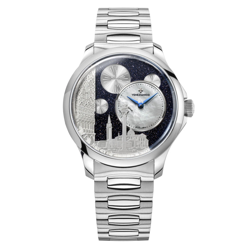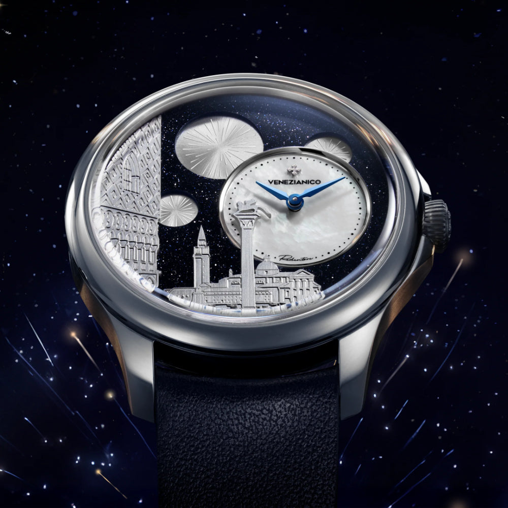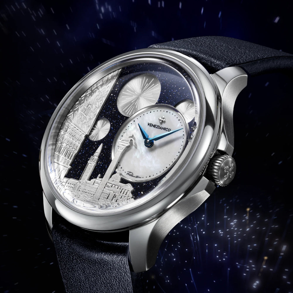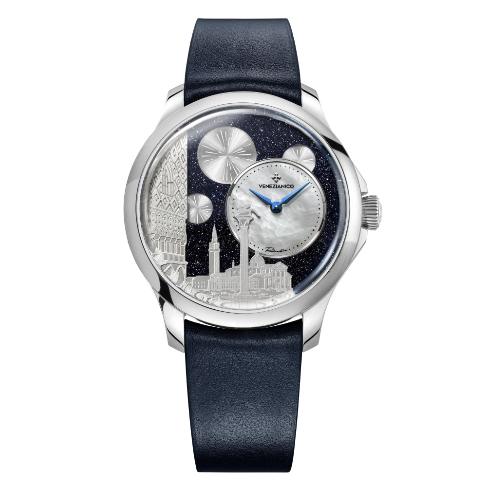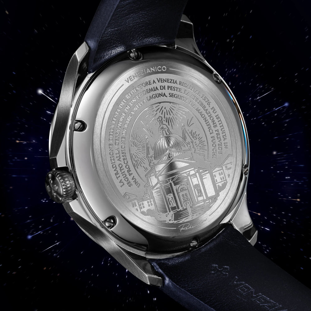 Il quadrante dell'orologio è un'evocativa rappresentazione della celebrazione del Redentore a Venezia. All'interno della composizione, Piazza San Marco prende vita nella notte, con la maestosa Basilica di San Giorgio Maggiore che si staglia sullo sfondo e il Palazzo Ducale sulla sinistra. Al centro della scena, il leone di San Marco si erge fiero, simbolo del potere della Serenissima. La notte stellata avvolge il tutto, offrendo una cornice magica e suggestiva per i fuochi d'artificio che illuminano il cielo, creando un'atmosfera di festa e gioia.MATERIALE CASSA: Acciaio 316LCARATTERISTICHE: Quadrante decentratoMATERIALI: Avventurina, madreperla, ottoneDIMENSIONI: u00d840 mm, da ansa ad ansa 46.70 mm, spessore 11.50mmMOVIMENTO: Cal. Seiko NH05A AutomaticoVETRO: Vetro in zaffiro con trattamento antiriflessoLUNETTA: Acciaio 316LRESISTENZA ALL'ACQUA: 5ATM (=50mt)CINTURINO: Vera pelle, Made in ItalyQuadrante decentratoUno degli elementi più distintivi del Redentore Bellanotte è il suo quadrante decentrato. Questa caratteristica, di solito riservata agli orologi di alta gamma, aggiunge un tocco di raffinatezza e originalità. Nel caso specifico, il quadrante decentrato è realizzato in madreperla bianca, un materiale iridescente che raffigura la luna ed è delicatamente incorniciato da un anello in acciaio lucidato. Tale disposizione separa la madreperla dal resto della composizione, che ritrae Piazza San Marco nella suggestiva notte del Redentore.Una costruzione su quattro livelliLa struttura del quadrante del Redentore Bellanotte è molto complessa e si sviluppa su quattro livelli distinti. Innanzitutto, vi è un cielo stellato realizzato in avventurina, seguito da un piccolo quadrante decentrato in madreperla. Subito dopo troviamo un disco satinato che raffigura i fuochi d'artificio, mentre sullo sfondo si trova un bassorilievo del Palazzo Ducale e della Basilica di San Giorgio Maggiore, entrambi rodiati. Questa intricata costruzione è resa possibile grazie all'utilizzo di un micro-movimento automatico con un diametro di soli 17,55 mm, fissato con un anello in ottone decorato con una finitura perlage.Le caratteristiche della cassaLa cassa del Redentore Bellanotte unisce design e funzionalità. Con un diametro di 40mm e uno spessore di soli 11.5mm, offre un equilibrio perfetto tra eleganza e praticità. La corona a cipolla, insieme a un proteggi corona ridotto, migliora l'ergonomia, facilitando la regolazione dell'orologio. Le anse armoniose, con attacco del cinturino curvo, assicurano una comodità ottimale al polso, garantendo un'esperienza di utilizzo piacevole e confortevole per tutta la giornata.L'ispirazioneIl quadrante dell'orologio è un'evocativa rappresentazione della celebrazione del Redentore a Venezia. All'interno della composizione, Piazza San Marco prende vita nella notte, con la maestosa Basilica di San Giorgio Maggiore che si staglia sullo sfondo e Palazzo Ducale sulla sinistra. Al centro della scena, il leone di San Marco si erge fiero, simbolo del potere della Serenissima. La notte stellata avvolge il tutto, offrendo una cornice magica e suggestiva per i fuochi d'artificio che illuminano il cielo, creando un'atmosfera di festa e gioia.Porta con te la tradizione lagunareIl Redentore Bellanotte incarna l'essenza stessa di Venezia, unendo tradizione e bellezza in un simbolo senza tempo. Questo orologio è un tributo all'arte e alla storia della città, catturando la magia delle sue notti stellate e l'eleganza delle sue celebrazioni. Ogni dettaglio racconta una storia di maestria artigianale e dedizione, rendendo questo segnatempo unico e prezioso. Indossarlo significa abbracciare l'anima di Venezia, portando con sé un frammento del suo incanto e della sua tradizione.